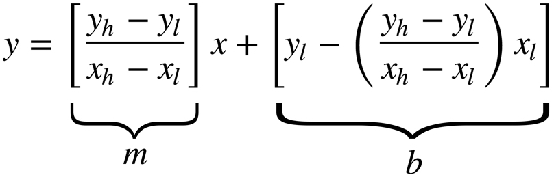 where \(m\) and \(b\) denote the slope and y intercept, respectively. The line connecting the two points in our example is given by the following slope: