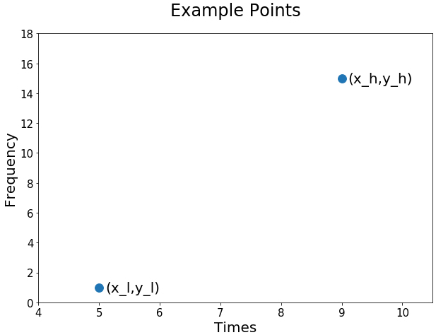At 05:00 we will assume a data point of 1 and at 09:00 we will assume a data point of \(15\). Using the high lower notation introduced in the previous blog the example points can be labeled as follows: \(x_l = 5\), \(y_l = 1\), \(x_h = 9\) and \(y_h = 15 \). First consider a simple plot of \((x_l,y_l)=(5,1)\) and \((x_h,y_h)=(9,15)\).